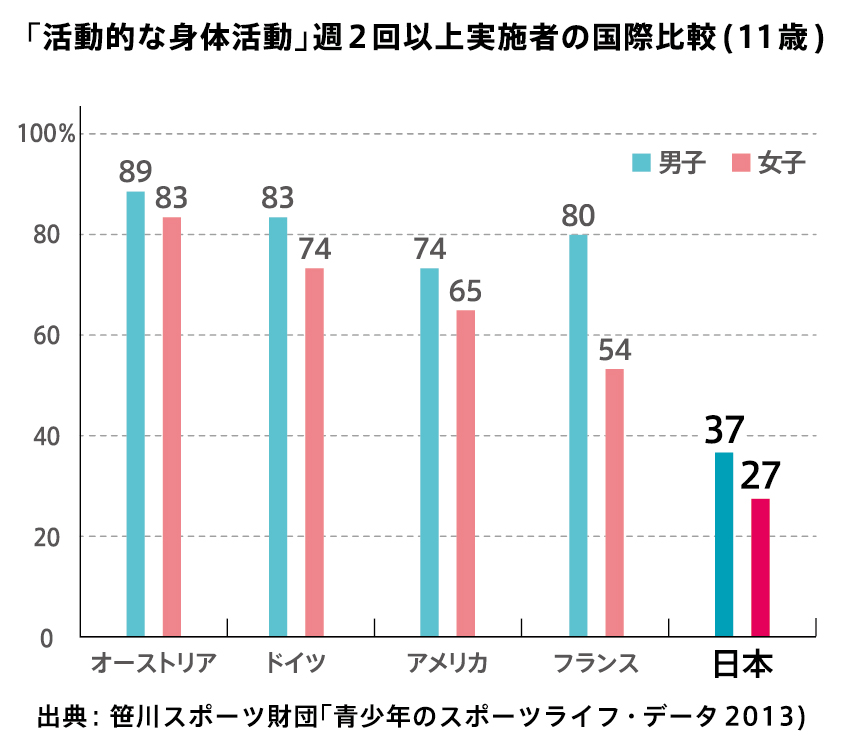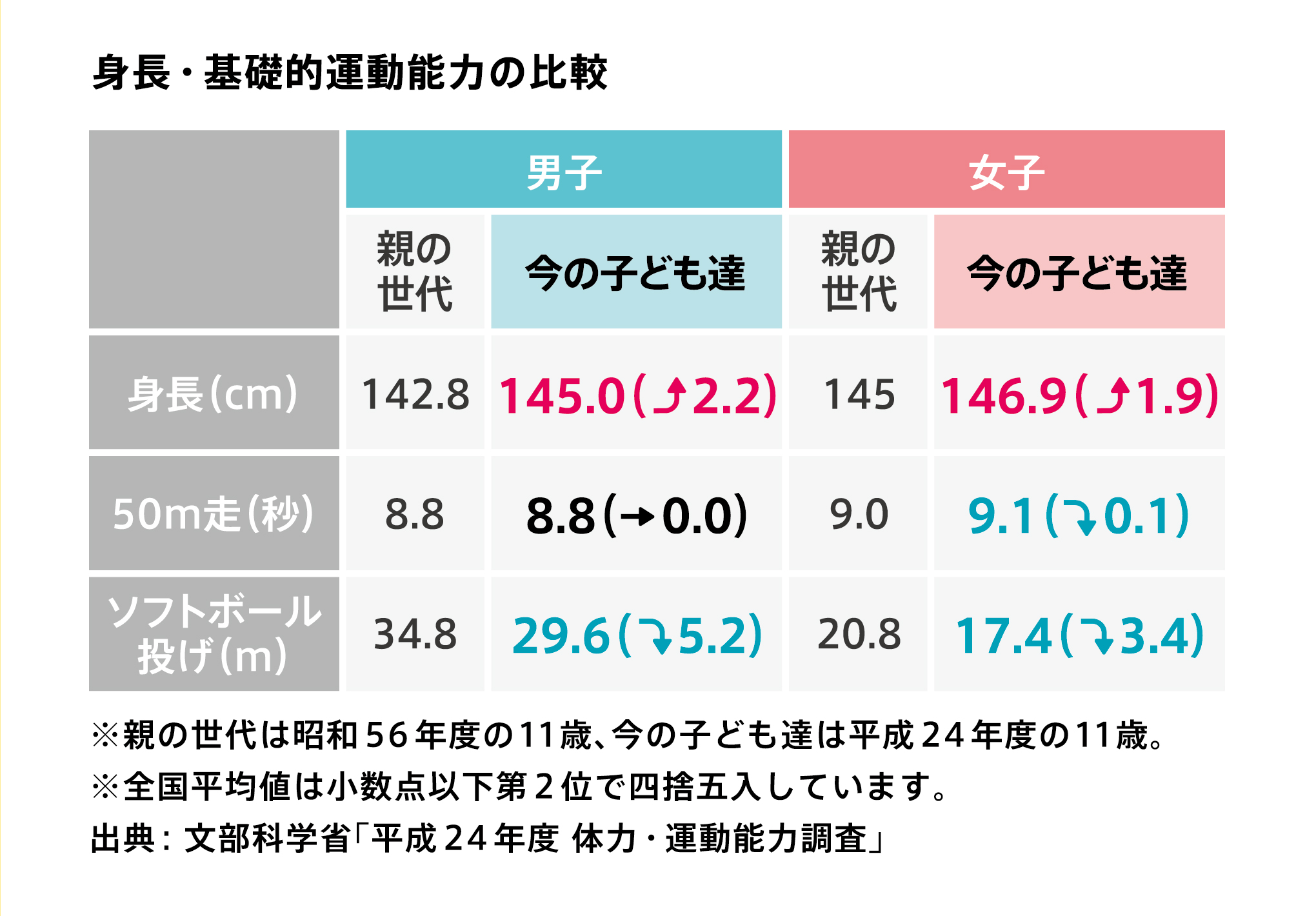 あそびが減った結果、楽しく体を動かす機会が少なくなり、日本の子どもたちの体力は低下したままです。