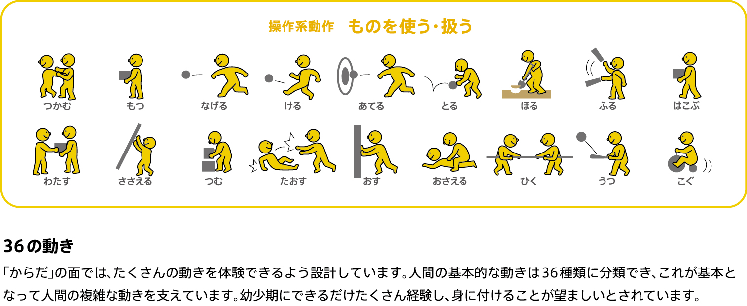 特に「からだあそび」に重点を置き、子どもが自分の発達と好みにあわせて最適なチャレンジができるつくりになっています。
